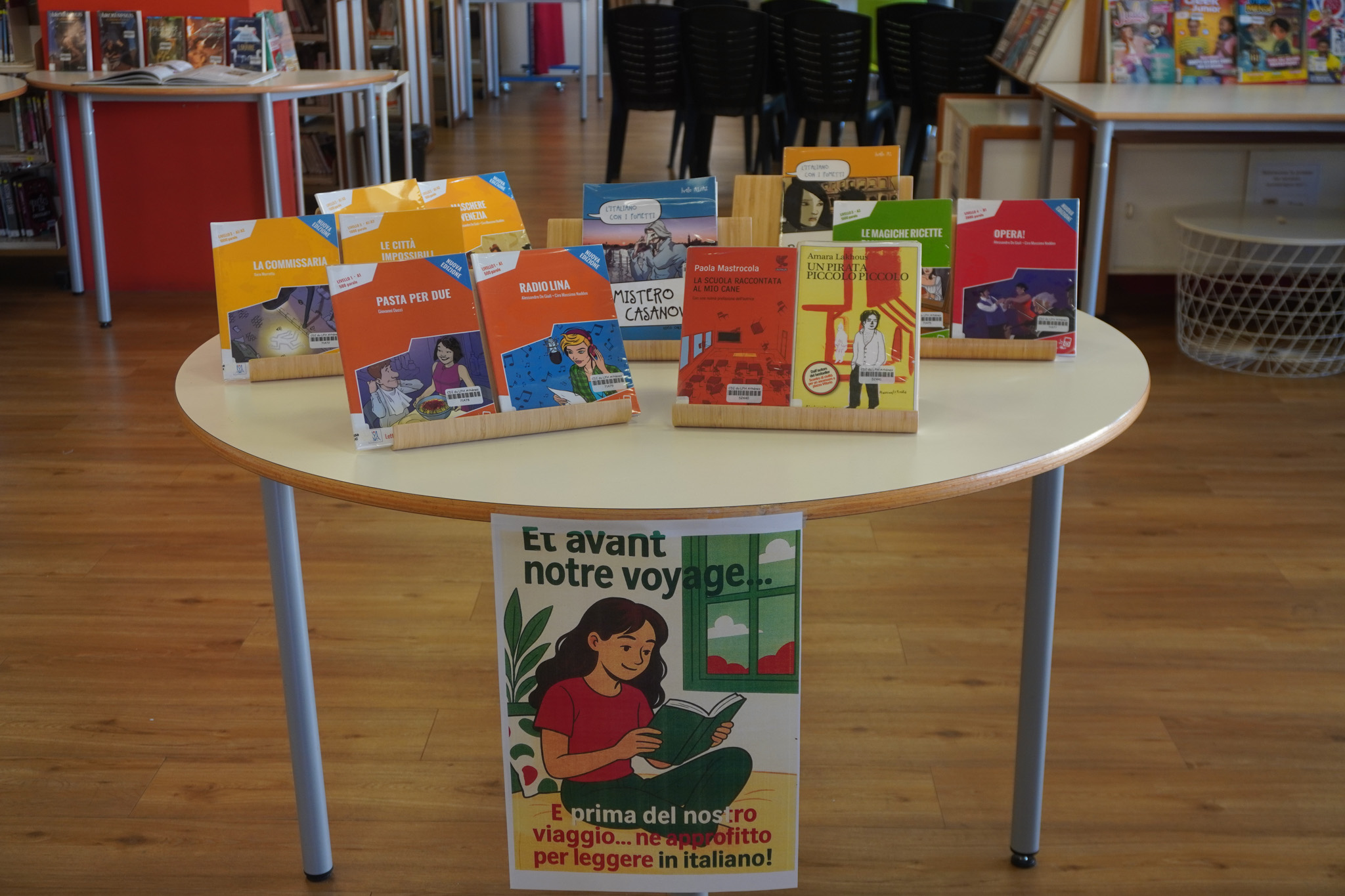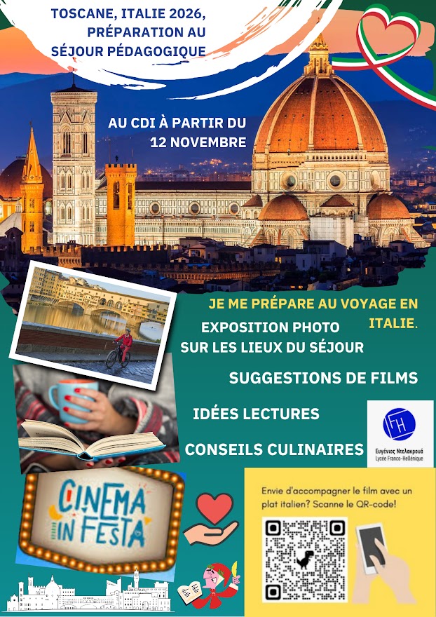 En novembre, le CDI a accueilli une exposition consacrée à la Toscane afin d’aider les élèves italianistes de 5ᵉ et de 4ᵉ à préparer leur voyage prévu en mars 2026. Cette initiative, conçue comme une première immersion culturelle, proposait un « cherche et trouve » élaboré à partir de photos de Florence, de Sienne et de Montecatini, que les collégiens découvriront lors de leur séjour. Une sélection de livres en italien invitait les élèves à lire en langue étrangère, tandis qu’un choix de films permettait de s’immerger dans l’Italie avant le départ. L’exposition proposait également des conseils culinaires pour inviter les élèves à cuisiner des spécialités régionales en lien avec les films sélectionnés. Soucieux de partager cette découverte, les élèves italianistes ont aussi invité les deux groupes de grec de niveau avancé, eux aussi participants au voyage, à venir visiter l’exposition afin de commencer ensemble leur préparation culturelle et de s’enthousiasmer pour la richesse et la beauté de la Toscane.